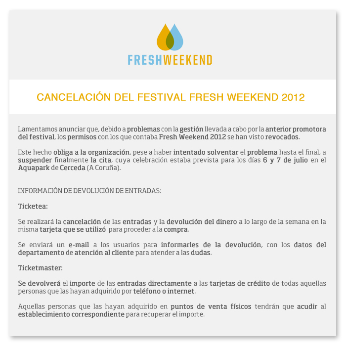 Según acabamos de saber el festival de Cerceda, Fresh Weekend ha sido cancelado, según exponen en su web por motivos de licencia de la anterior empresa gestora. Exponemos el texto íntegro a continuación:
